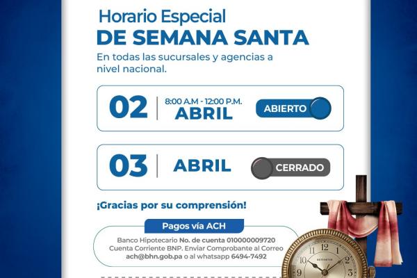 El Banco Hipotecario Nacional (BHN) informa a toda su distinguida clientela que, con motivo de la Semana Santa, estaremos laborando en horario especial.